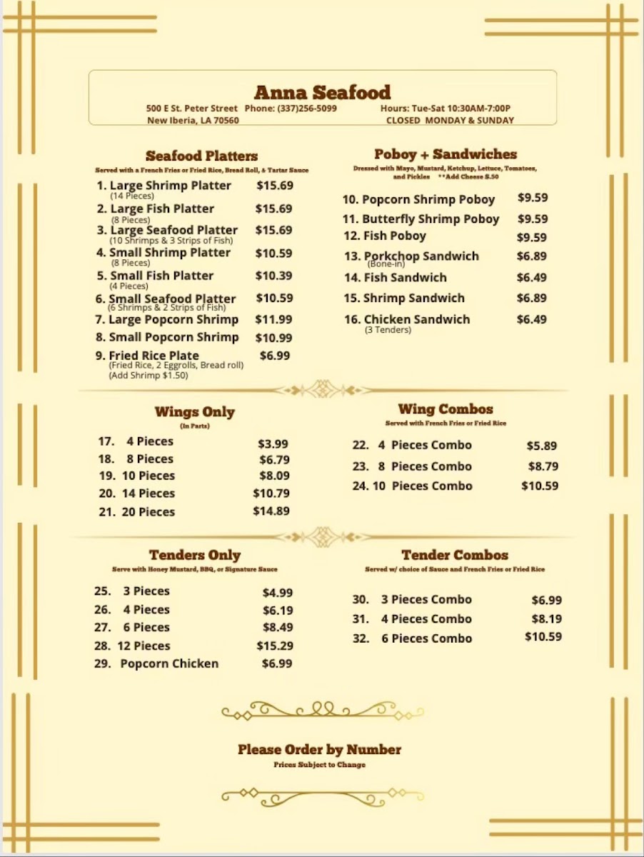 Welcome to Anna Seafood, your go-to destination in New Iberia for a delightful seafood experience. Located at 500 E St Peter St, this charming eatery is celebrated for its extensive menu, which boasts a variety of seafood platters including large and small shrimp, fish, and popcorn shrimp, perfect for any appetite.